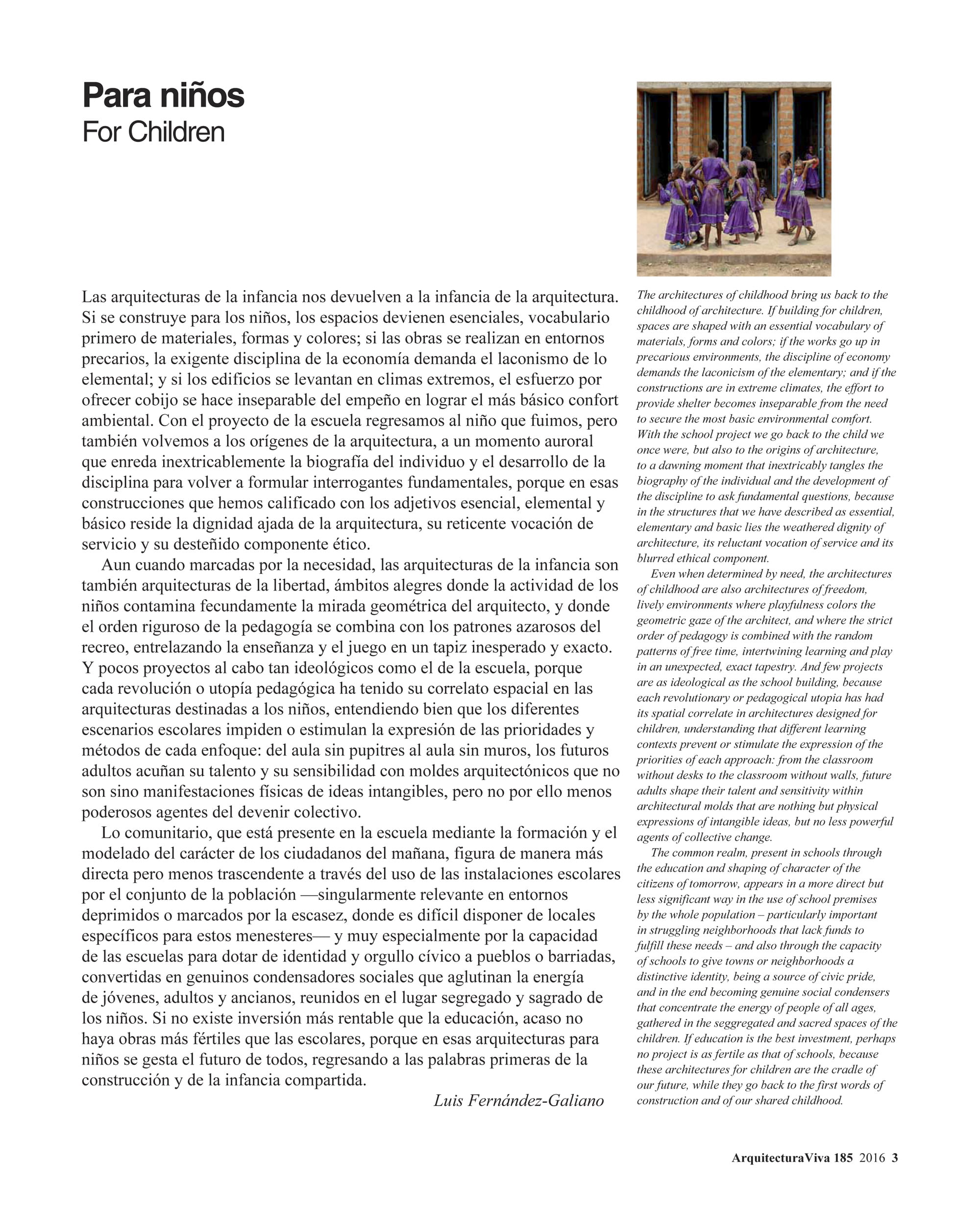 Le architetture dell’infanzia ci riportano all’infanzia dell’architettura. Se è costruito per i bambini, gli spazi diventano essenziali, primo vocabolario di materiali, forme e colori; se i lavori sono eseguiti in ambienti precari, l’impegnativa disciplina dell’economia esige il laconismo delle elementari; e se gli edifici sono costruiti in climi estremi, lo sforzo di offrire riparo diventa inseparabile dallo sforzo di raggiungere il comfort ambientale più elementare. Con il progetto scolastico si ritorna al bambino che eravamo, ma si ritorna anche alle origini dell’architettura, a un momento aurorale che indissolubilmente intreccia la biografia dell’individuo e lo sviluppo della disciplina per riformulare questioni fondamentali, perché in quelle costruzioni che abbiamo qualificato con gli aggettivi essenziali, elementari e basilari sta la sbiadita dignità dell’architettura, la sua reticente vocazione al servizio e la sua sbiadita componente etica. Anche se segnate dalla necessità, le architetture dell’infanzia sono anche architetture di libertà, ambienti gioiosi dove l’attività dei bambini contamina fruttuosamente lo sguardo geometrico dell’architetto, e dove l’ordine rigoroso della pedagogia si sposa con gli schemi casuali di recesso, intrecciando insegnamento e gioco in un arazzo inaspettato ed esatto. E pochi progetti in fondo ideologici come quello della scuola, perché ogni rivoluzione o utopia pedagogica ha avuto il suo correlato spaziale nelle architetture destinate ai bambini, comprendendo bene che i diversi scenari scolastici impediscono o stimolano l’espressione delle priorità e dei metodi di ogni approccio : dall’aula senza banchi all’aula senza pareti, i futuri adulti coniano talento e sensibilità con stampi architettonici che non sono altro che manifestazioni fisiche di idee immateriali, ma non meno potenti agenti di divenire collettivo. La comunità, che è presente nella scuola attraverso la formazione e la modellazione del carattere dei cittadini di domani, appare in modo più diretto ma meno trascendente attraverso l’uso delle strutture scolastiche da parte della popolazione nel suo insieme —particolarmente rilevante in ambienti depressi o segnate dalla scarsità, dove è difficile avere premesse specifiche per questi compiti, e soprattutto per la capacità delle scuole di fornire identità e orgoglio civico a paesi o quartieri, trasformati in veri condensatori sociali che uniscono le energie dei giovani, adulti e anziani, radunati nel luogo segregato e sacro dei bambini. Se non c’è investimento più redditizio dell’istruzione, forse non ci sono opere più fertili di quelle scolastiche, perché in quelle architetture per bambini si crea il futuro di tutti, tornando alle prime parole di costruzione e infanzia condivisa.