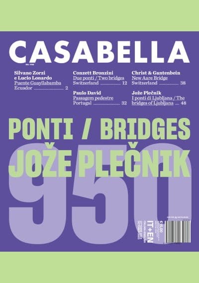 In apparenza uno soltanto è il tema di cui si occupa «Casabella» 950: la costruzione dei ponti. Tra tutte le costruzioni il ponte è la più ardita. Lo era nei tempi più lontani quando i pontifices (Pontifex è ancora oggi il vescovo di Roma) erano i sacerdoti che officiavano i riti richiesti da ogni impresa che comportasse la pericolosa violazione della sacralità dell’acqua. Oggi la numinosa arditezza dei ponti è espressa dalla varietà delle loro forme, come «Casabella» 950 intende suggerire: a partire dalla stupefacente essenzialità di un ponte progettato da Silvano Zorzi in Ecuador, dalle ricerche condotte da uno studio tanto raffinato quanto affidabile quale Conzett Bronzini Partner, dalle contrastanti realizzazioni di Paulo David e di Christ & Gantenbein, per arrivare alla straordinaria sistemazione del centro di Ljubljana che Jože Plečnik modellò intorno ai corsi d’acqua e alla centralità dei magnifici ponti che costruì per attraversarli. Molte pagine di «Casabella» 950, però, trattano di un argomento del tutto diverso, ovvero della monumentale, recente monografia dedicata a Michelangelo di Horst Bredekamp, dalla quale quanti d’ora in poi vorranno conoscere l’opera del massimo architetto moderno non potranno prescindere.Sommario / Summary