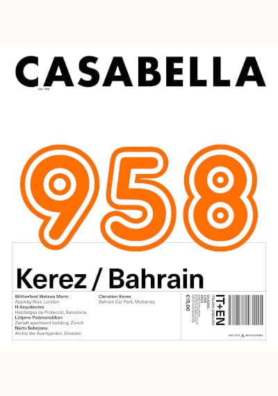 Anche in Europa le condizioni economiche e le scelte politiche vanno ridimensionando i provvedimenti volti a sostenere il welfare. Tra questi vi sono quelli in favore delle abitazioni sociali, intendendo la parola housing che li riassume nel senso più ampio. Tuttavia l’housing continua ad essere uno dei temi con i quali gli architetti dovrebbero confrontarsi con maggiore dedizione. Il numero 958 di «Casabella» lo ribadisce presentando tre edifici completati recentemente a Londra, a Zurigo e a Barcellona da Witherford-Watson-Mann, da Lütjens-Padmanabhan e da HA Arquitectes, che suggeriscono come questo terreno di ricerca possa venire affrontato da prospettive differenti, destinate a tradursi in ricerche altrettanto diverse. A un nuovo museo, l’Archiv der Avantgarden Egidio Marzona costruito a Dresda da Nieto-Sobejano, sono dedicate le pagine centrali di «Casabella» 958, che inquadrano quest’ultima opera tra altri sette edifici con funzione museale che Nieto-Sobejano hanno realizzato nel corso della loro carriera e che la caratterizzano in maniera che non ha uguali. La ampia parte conclusiva di «Casabella» 958 ospita quattro costruzioni, tanto sorprendenti quanto inedite, firmate da Christian Kerez per dotare il centro di Muharraq in Bahrain di un sistema di parcheggi. Questo sistema si articola in quattro edifici costruiti nel tessuto più consolidato dell’insediamento urbano. Tutti e quattro puntano sulla sovrapposizione di piani variamente piegati che annullano ogni differenziazione funzionale e si traducono in una vera propria esaltazione del tema dell’aggetto. Data l’originalità dei risultati ottenuti, «Casabella» presenta nel dettaglio la documentazione dell’iter progettuale grazie al quale una ideazione costruttiva tanto singolare quanto sorprendente quale quella messa a punto in questa occasione da Kerez si è tradotta in realtà.
