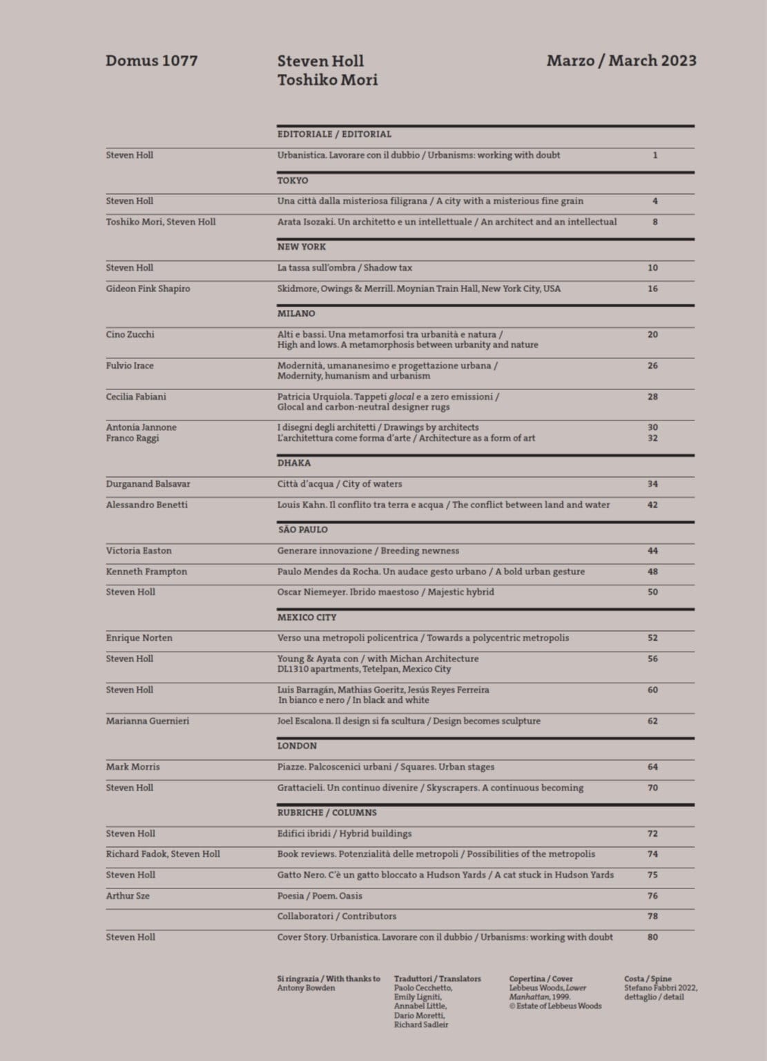 Il numero di marzo di Domus si concentra sul tema progettuale dell’urbanistica. Holl, nel suo Editoriale, racconta dubbi e speranze sul divenire delle città, attraverso la lettura di sette metropoli. “Pur lavorando con il dubbio, nutriamo la speranza che si avvii un’opera di protezione, restauro e riforestazione di una porzione di territorio equivalente a quella delle nuove costruzioni urbane, permettendo all’aumento della densità urbana di diminuire lo sprawl distruttivo”.Partendo da Tokyo, Holl indaga l’identità della città più popolosa del pianeta si trova nelle sue stratificazioni urbane, nell’alternarsi di caos, grattacieli, piccoli edifici, tecnologia elettronica e ikebana. A seguire i guest editor di Domus 2023 ricordano Arata Isozaki, scomparso di recente, tratteggiando un suo ritratto personale e professionale.