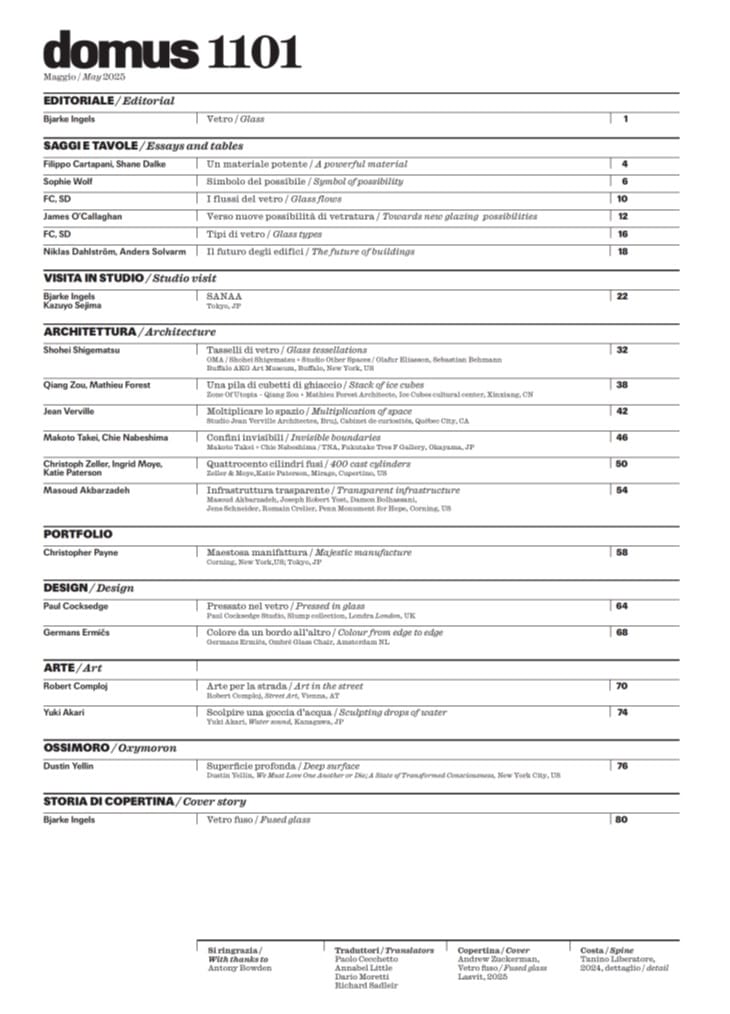 Le tavole, curate da Filippo Cartapani e Shane Dalke, architetti dello studio Big che collaborano con il guest editor, offrono un’analisi concisa ma esaustiva di un materiale potente. I flussi del vetro ne delineano la complessa filiera produttiva e le sfide legate al riciclo. Tipi di vetro fornisce una panoramica tecnica delle diverse tecniche di produzione e delle relative proprietà. La visita in studio ci conduce nell’universo creativo di Sanaa, attraverso un dialogo tra Bjarke Ingels e Kazuyo Sejima: un’incontro d’eccezione tra dueprotagonisti assoluti della scena architettonicaa cavalo del XX e XXI secolo. L’intervista svela come lo studio giapponese abbia esplorato il vetro non solo come diaframma trasparente ma come materiale con una propria identità, plasmando spazi fluidi e inattesi in progetti iconici come il Toledo Museum of Art Glass Pavilion e il Rolex Learning Center.