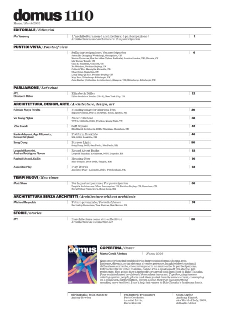 Esce Domus 1110, numero di marzo 2026, affidato al guest editor Ma Yansong, che con la semplicità di chi non ha bisogno di stupire enuncia la tesi centrale: il progetto contemporaneo non può più essere un atto solitario. È uno sport di squadra. Lo dice anche la copertina di Marta Cerdà Alimbau: quattro cordoncini intrecciati che formano una rete. Non una metafora decorativa, ma un diagramma strutturale: persone, luoghi, saperi tenuti insieme dalla tensione reciproca.