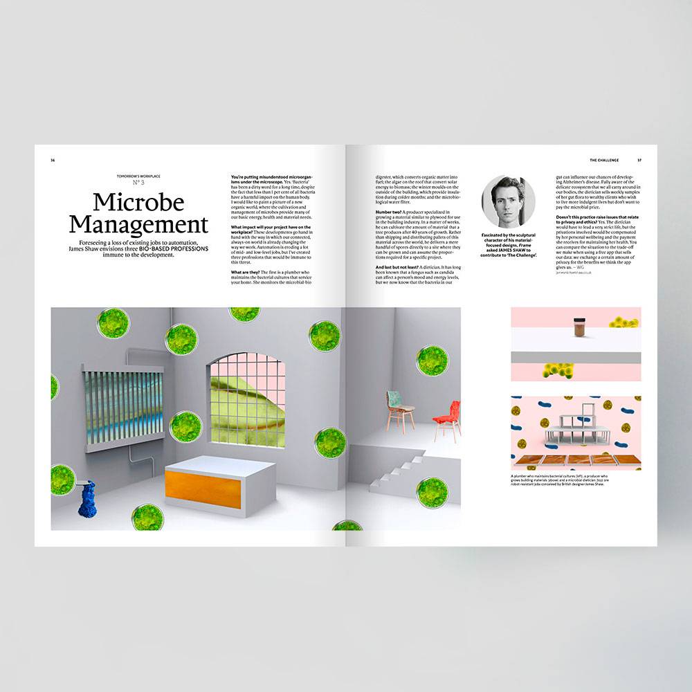 Frame challenges emerging designers to answer a topical question with a future-forward concept. Sparked by media reports that robots are likely to replace half of all jobs over the next 20 years, we commissioned five makers to design an item, tool, space or service that relates to the anticipated automation of tomorrow’s workspace.