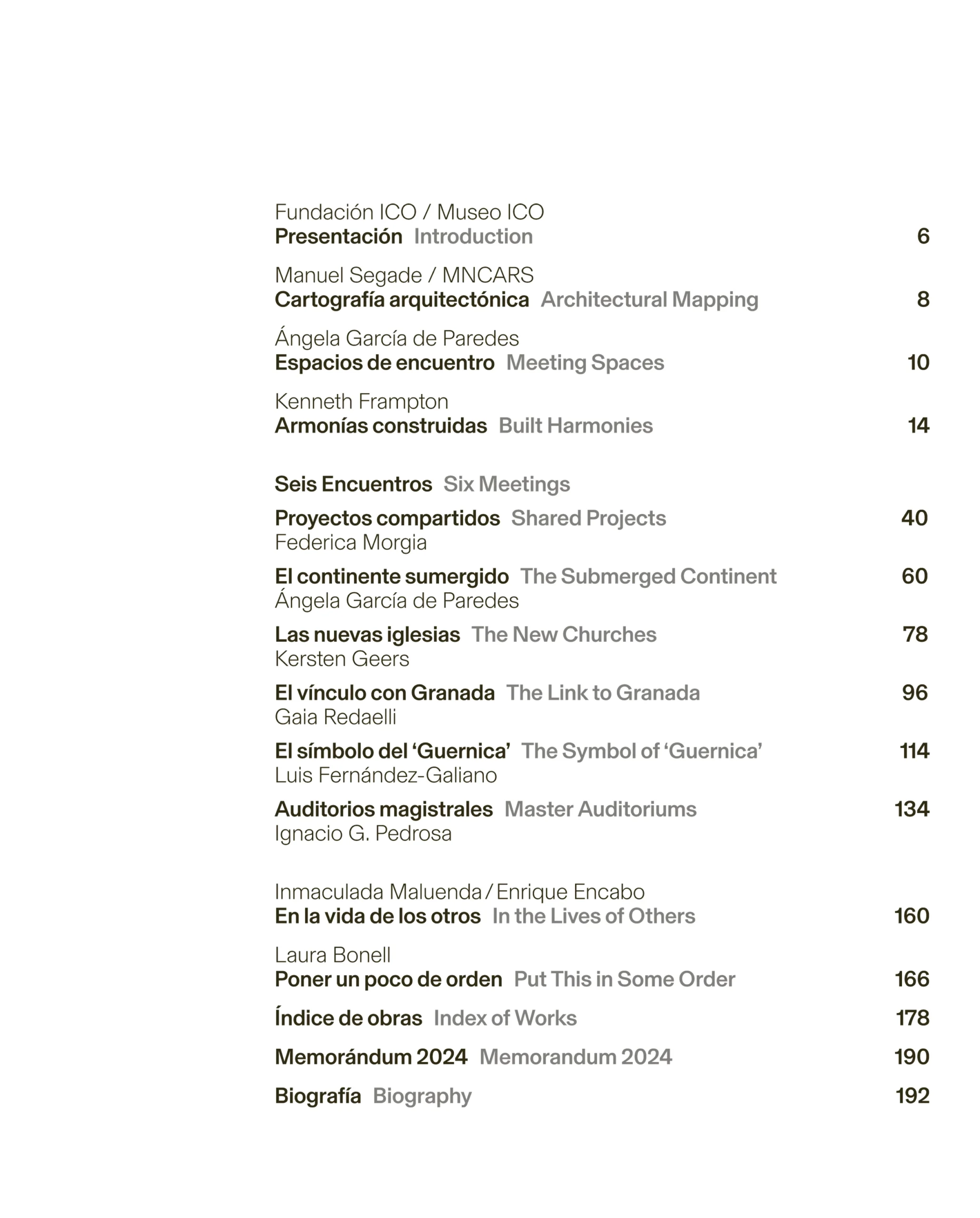 Insieme a loro, le collaborazioni di Inmaculada Maluenda/Enrique Encabo e Laura Bonell fanno luce su questi dialoghi e aiutano a comprendere le chiavi del processo di lavoro dell’architetto. Presentata sulla sovraccoperta, una “mappa di incontri” sviluppa graficamente, classifica e mette ordine in quella rete arricchente di progetti, architetti, artisti o musicisti che hanno fortemente influenzato il lavoro e la vita di García de Paredes.