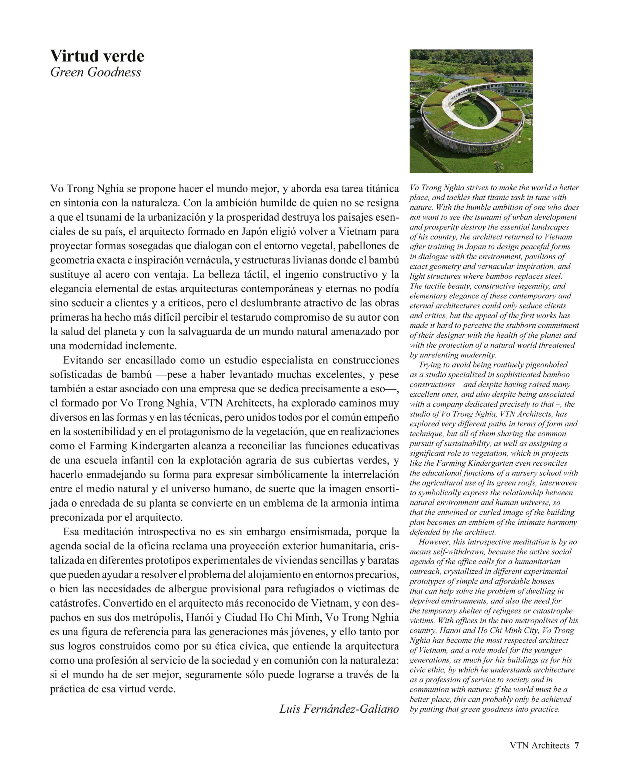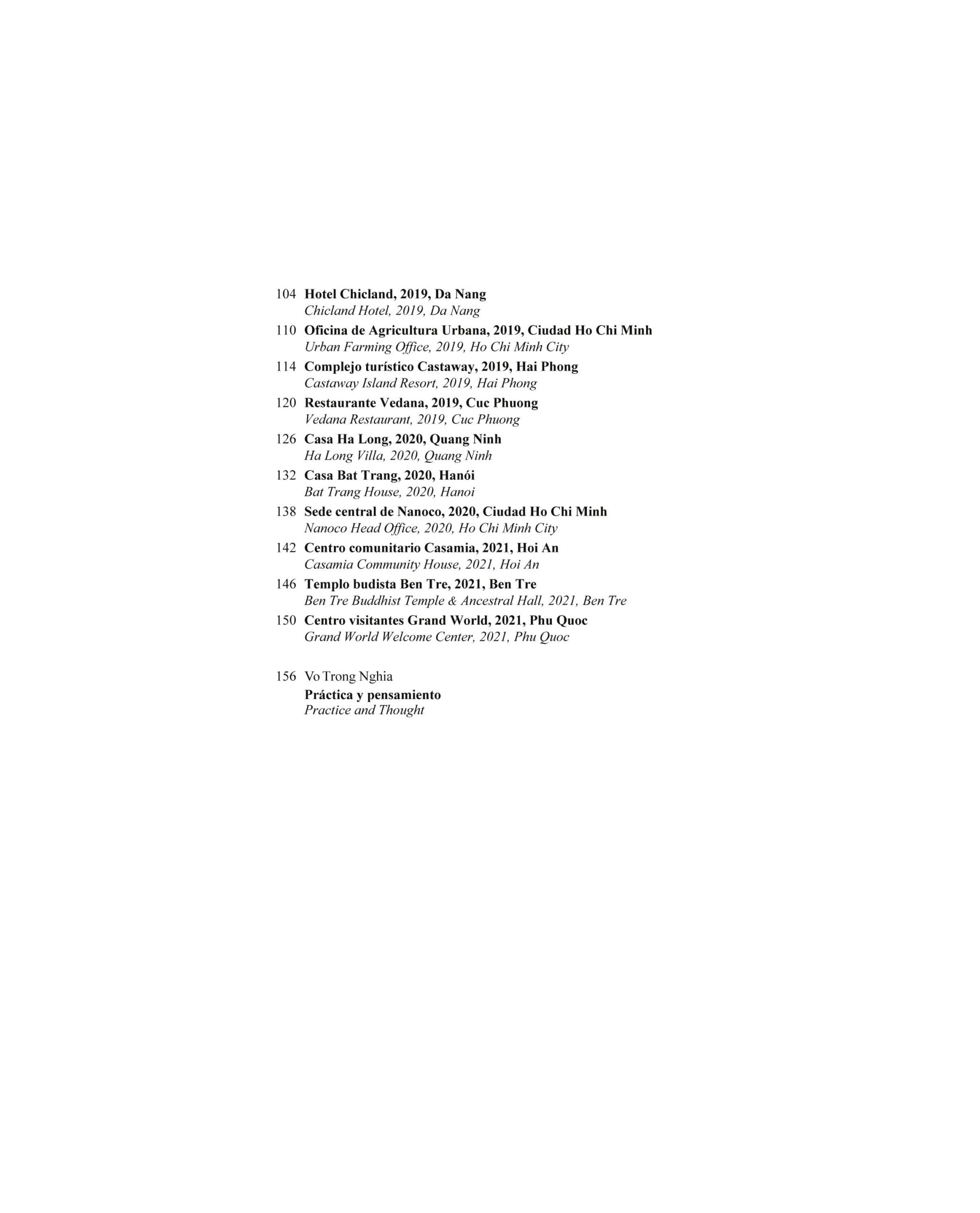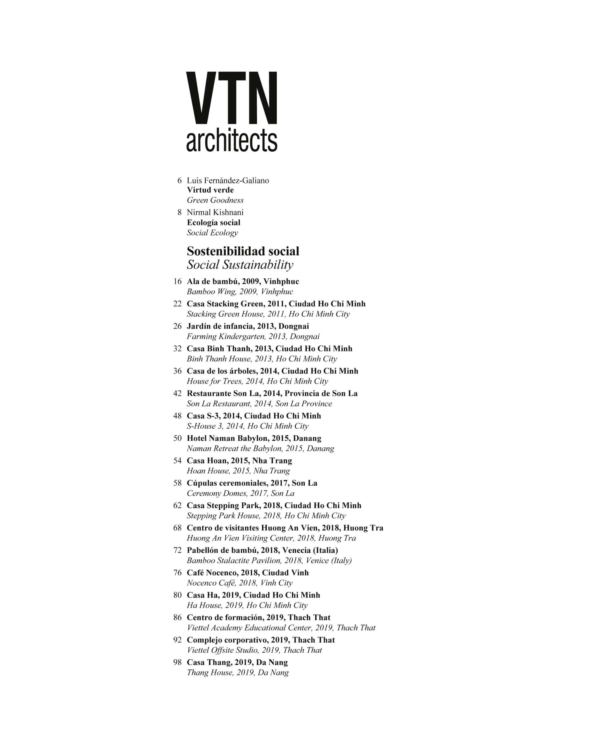 Ora, in un volume di 160 pagine, rilegatura cartonata ed edizione bilingue spagnolo-inglese, la casa editrice Arquitectura Viva include una meticolosa selezione di 28 opere e progetti, introdotti da un testo di Luis Fernández-Galiano e da un saggio di Nirmal Kishnani. , e una coda introspettiva dello stesso Vo Trong Nghia, in cui riflette sul metodo pratico e sul pensiero teorico dello studio.